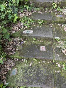 私もサポーターと一緒に山代温泉を回りましたが、2・3年間の学びを活かし、他の班が足を運ばない奥まった場所にも立ち寄っていました。そこで見つけた特徴的な階段や仕掛けについて、「どうすればもっと多くの人に知ってもらえるか」といった話題で意見を交わしていたのが印象的でした。こうした発見や発想は、これまでの経験の積み重ねから生まれているのだと感じました。下の写真はフィールドワーク中に見つけた、石の階段です。普通の石段と違って、あいうえおが書かれており、散策者がどんどん上に行きたくなるような工夫がされていて、このようなユーモアさが大切だと感じました。私は思わず声に出しながら、意気揚々と階段に上がりました笑