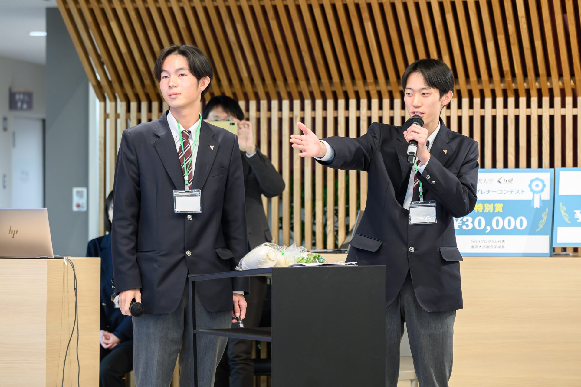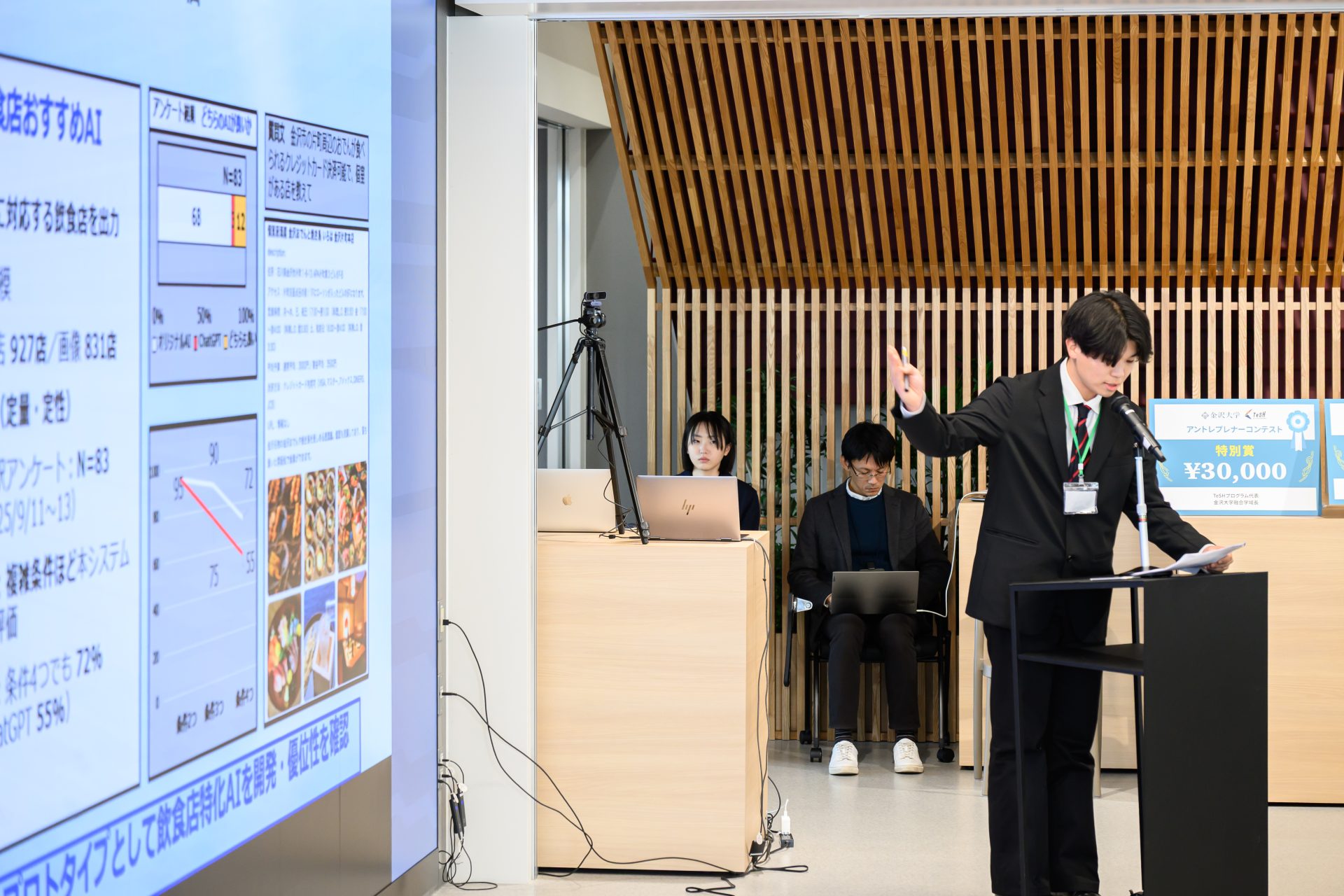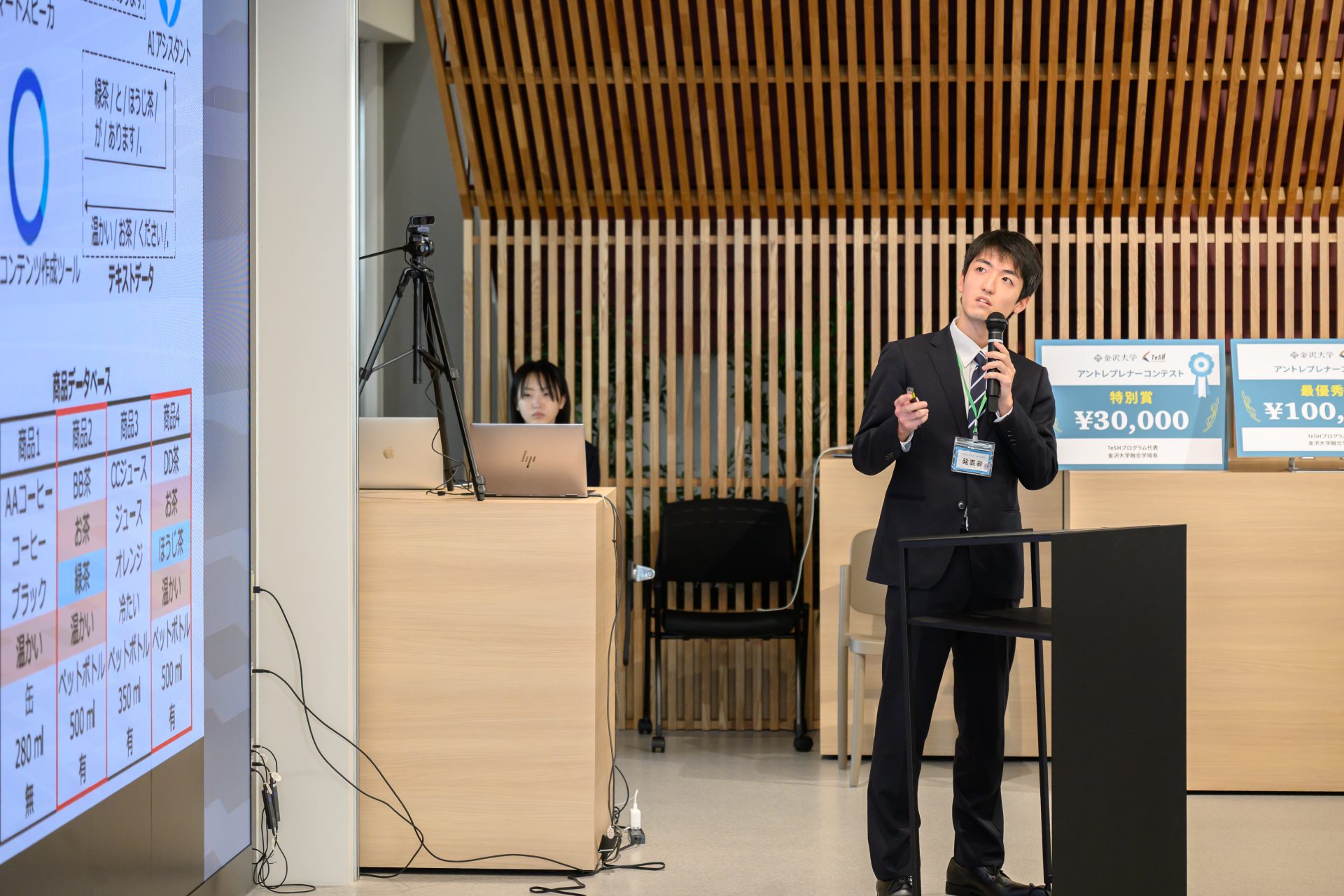 最優秀賞に選ばれたのは、VIVASチーム(代表:金沢大学自然科学研究科・泉 昂希さん)による「視覚障害者用自動販売機音声案内システムの開発」です。