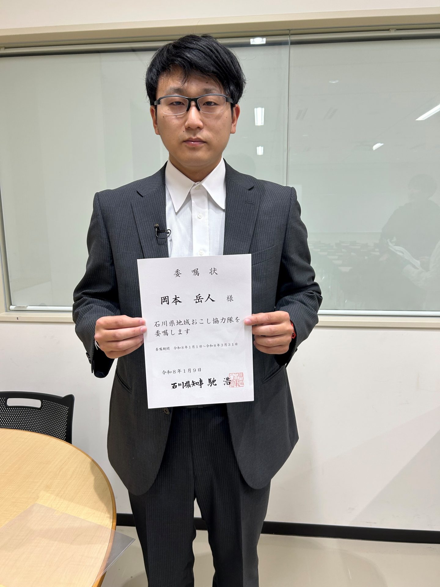 1月9日、石川県庁にて、先導学類4年の岡本岳人さんが石川県地域おこし協力隊(起業伴走支援)に委嘱されました。能登地域での起業を促進することで、能登半島地震からの復興や地方創生を加速することを目的に、起業に伴走支援する人材として3名の募集があり、そのうちの1名として岡本さんが採用されたものです。任期は2026年1月から3月までですが、その後は成果によって延長があり、年度更新で3年ほどの期間を隊員として従事する予定でいます。