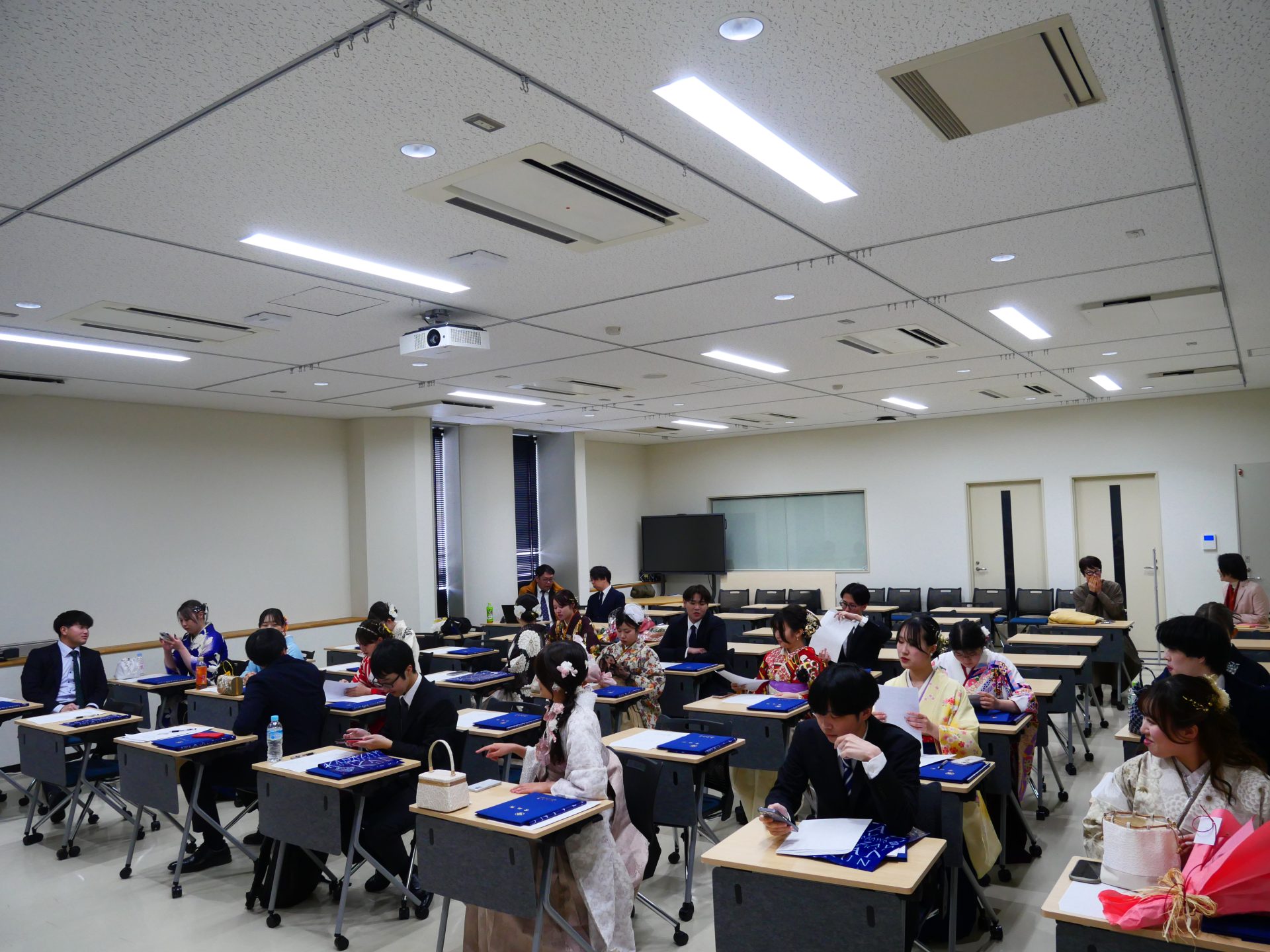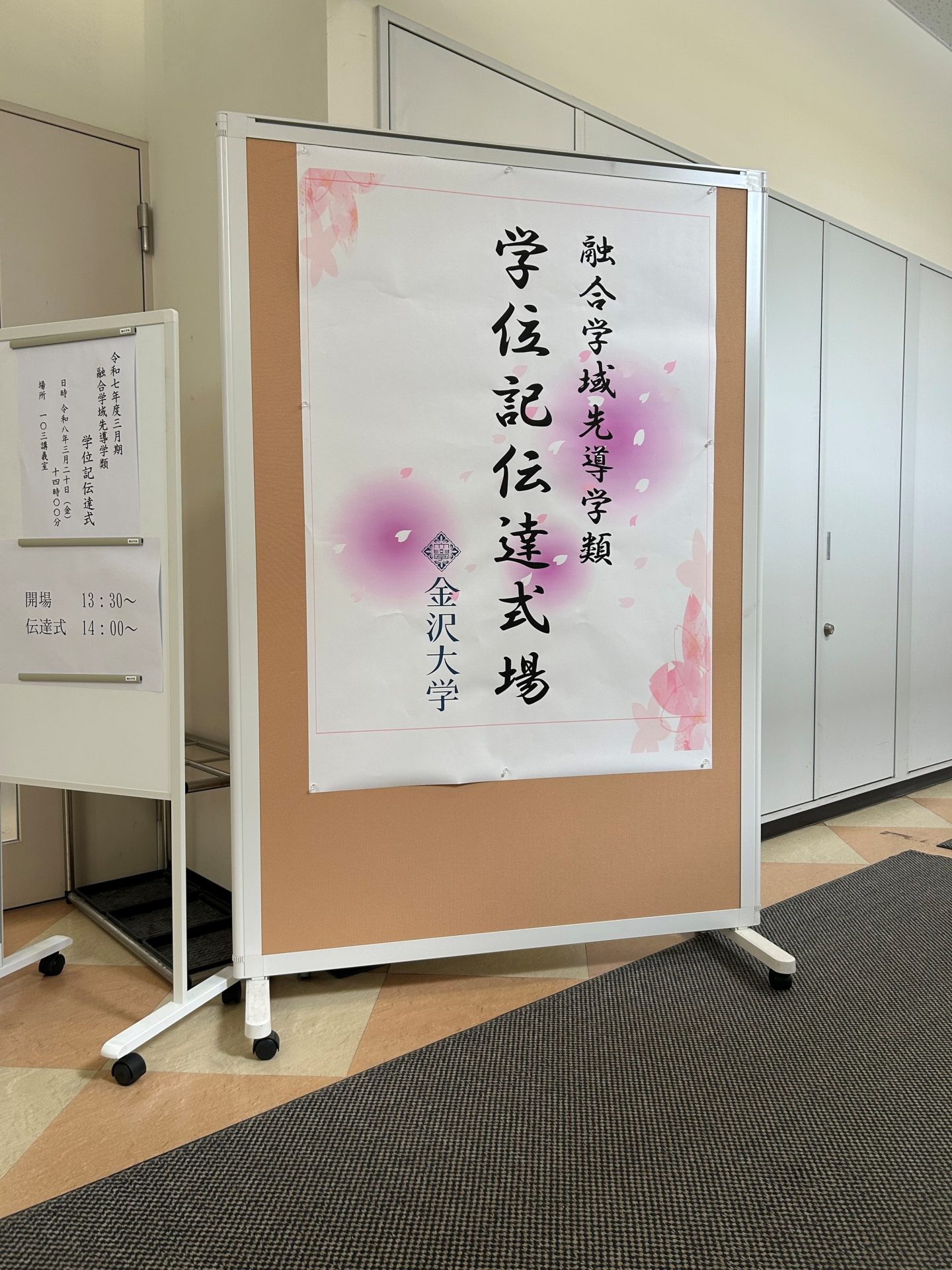当日は10時より金沢歌劇座にて令和7年度金沢大学学位記・修了証書授与式が挙行され、 全体での式に参加後、融合学域先導学類と観光デザイン学類の卒業生は、学類毎の学位記伝達式に角間キャンパスに集まりました。