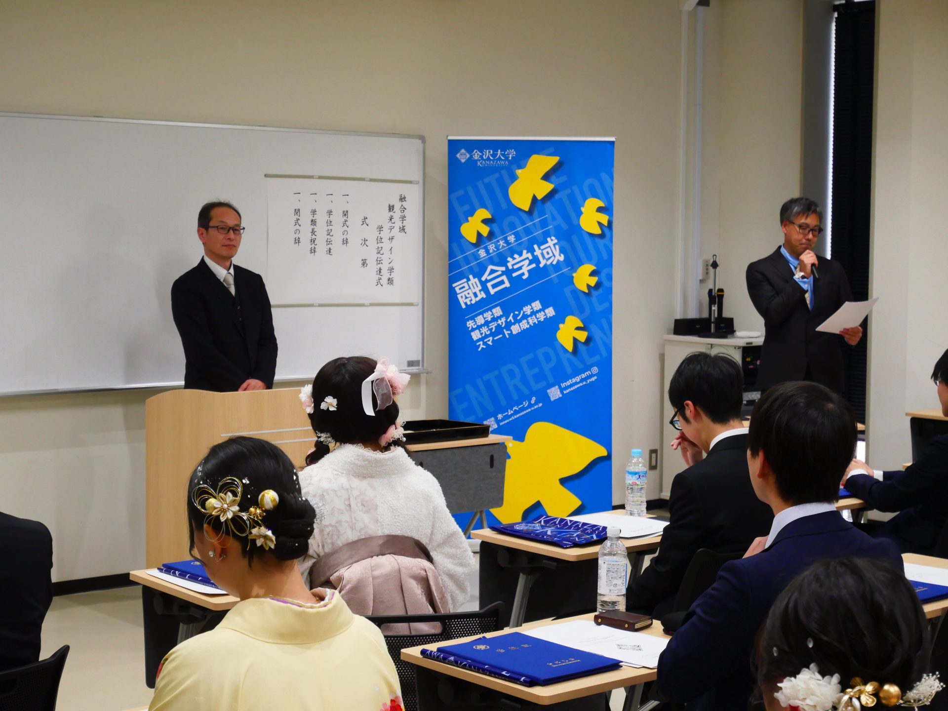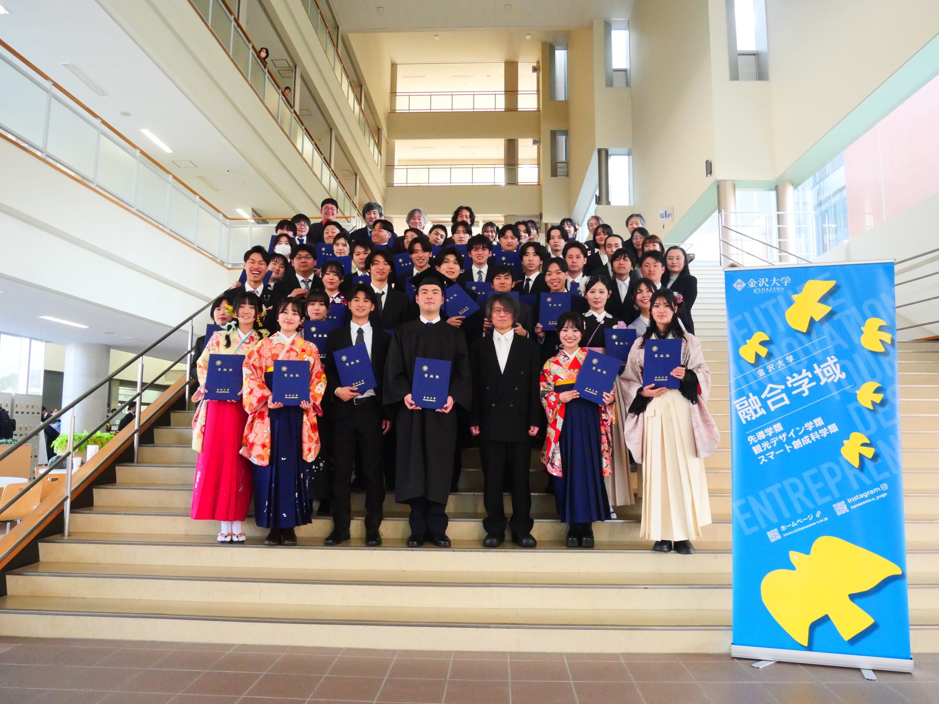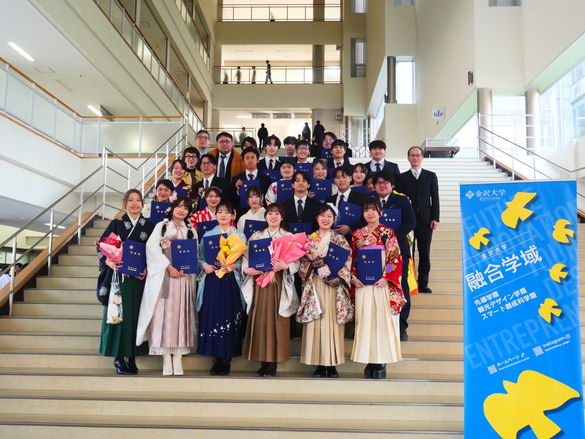 3月20日14時より、金沢大学角間キャンパス自然科学本館講義室にて、融合学域先導学類及び観光デザイン学類の学位記伝達式が行われました。晴天に恵まれ、袴姿の学生たちが華やかさを演出する記念の一日になりました。